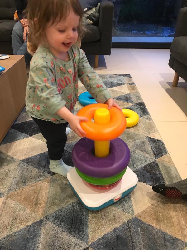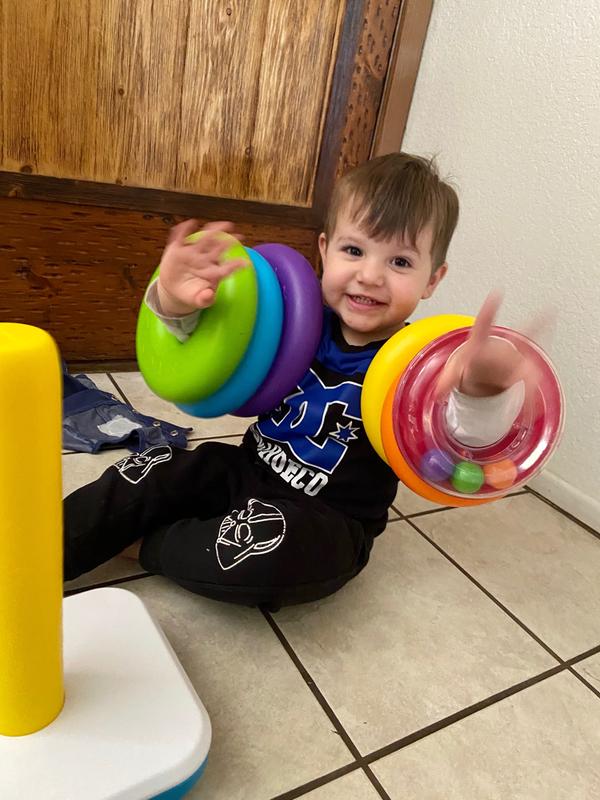 I bought this to use with children with disabilities, thinking I could work on trunk strength and reach. Unfortunately, even for 4 year olds, the width of the rings was so thick none of the kids I work with can actually grasp the rings. I wish they were more hula hoop width, or the width of the rings on the small stacker, but maybe more rings to get the height.