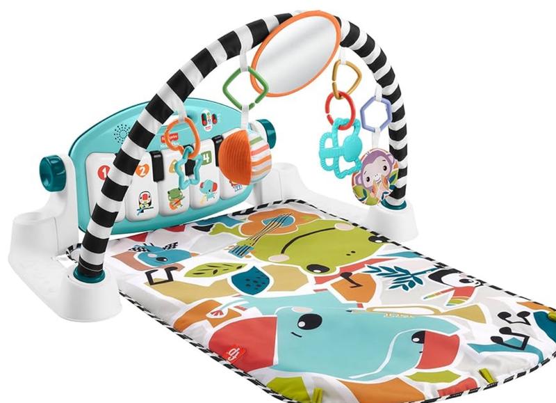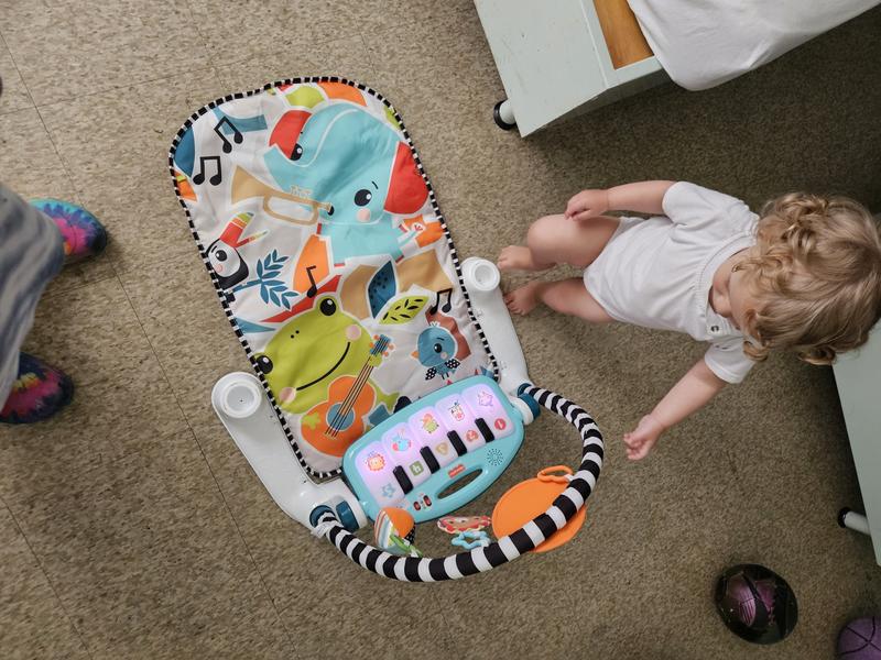 I regularly babysit My 2 year old grandaughter. She really liked the piano. The nice handle made it easy for her to carry around. The different songs are nice, catchy tunes. The piano plays nicely. The sound level is perfect. She also likes the ball and links to play with, which are easy for her to link. She found the colorful lay mat very fun to sit on. Although shes to big to lay down and play with the toys hanging down, she was still very interested in playing with all components. It is very easy to clean the toys and piano. The mat cleans up nicely with a damp cloth.