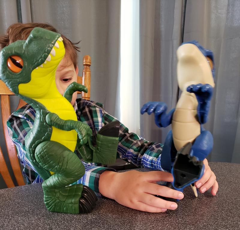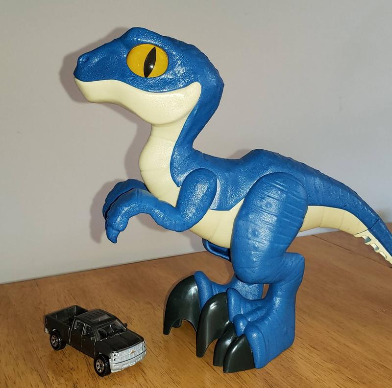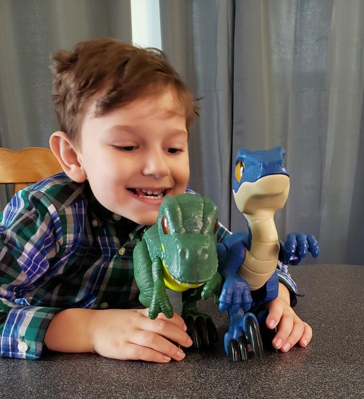 My son received the Imaginext Jurassic World Raptor XL a couple weeks ago and had really enjoyed playing dinosaurs with it. He loves that the looks are movable so he can put them in different positions and they don't fall over (even standing on one leg). He got this with the T Rex and the two of them together have been a favorite of his. They have held well great to some very rough play (my son is 5 and is rough on his toys). They don't make any sound themselves but he has had no problem (and seems to really enjoying) making their roars for them. Overall a great toy that allows his imagination to show!