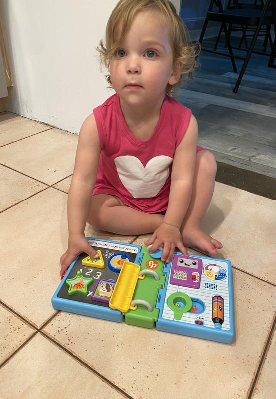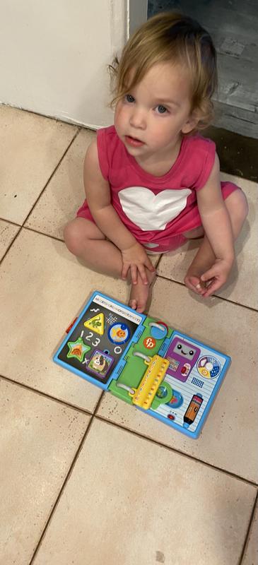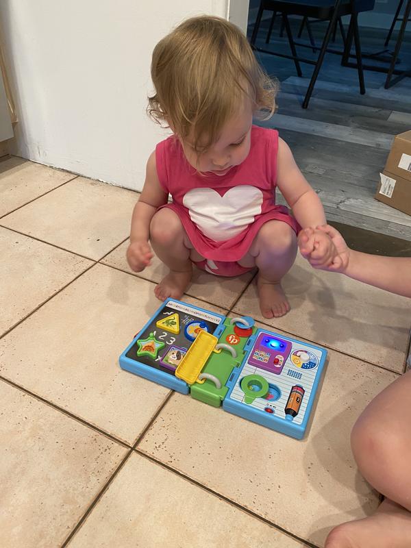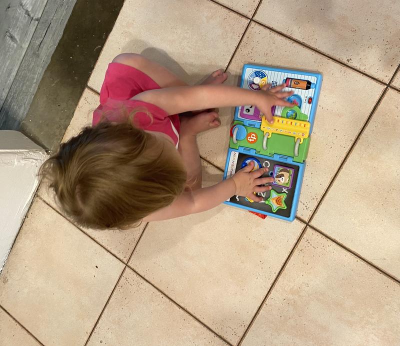 My 21 month old loves the Laugh and Learn Schoolbook. The lights, music, and sounds engage her while it is light enough for her to carry around when she is on the go. Her favorite feature is the weather wheel, which she loves to spin. This is definitely a fun, hands-on toy which adds learning to the mix!