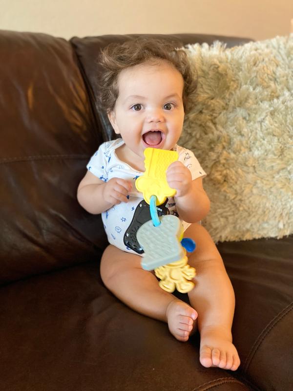 I thought my 24 month old might play with this for a day and be done but she loves her Fisher Price Puppy keys. She loves all the sounds the toy key fob makes. She desperately wants to get Puppy off of the keychain. I think a younger baby would absolutely love the teething toy.