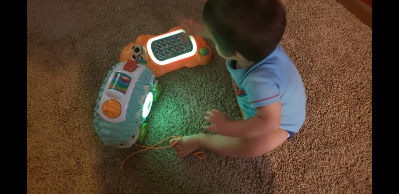 How excited the baby was to find this toy from Santa Claus. He immediately went for the toy and began playing with it. He quickly figured out that it had music and sound and that made it more fun. Great toy! I could not have made a better choice!