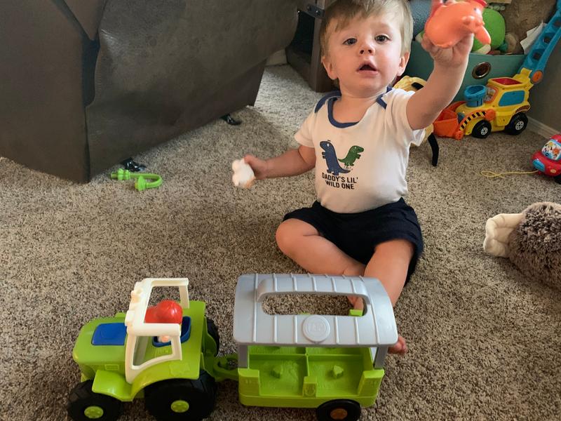 I could not open the box fast enough on the tractor and wagon with animals. My twin grandsons went crazy over it! They liked that they could make the farmer/caretaker talk. If you have a little tractor lover in your house this is a perfect starter. It is a good size to handle. Now I do have a couple of things I wish were different. The wagon hooks easy which is great but comes off easy and it frustrated the boys. It only came with 2 animals but 4 places for animals and 4 animals would have been nice. But they didn't care about there only being 2.