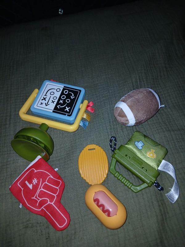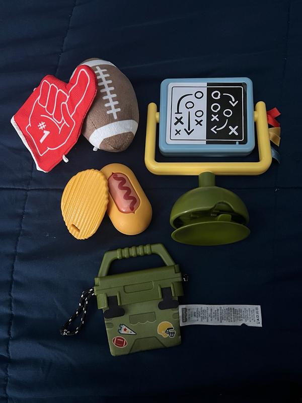 I loved these little toys for my baby! She’s starting to explore the world, and the Mini Me Moments Tiny Tailgater set came with so many fun options for her to play with. The plush football is super soft, and the scoreboard doubles as a mirror with a suction base so it sticks to flat surfaces. It also includes a cute flexible rubber “potato chip” teether that you can secure with a pacifier clip and a hotdog that lets you choose between “ketchup” or, being from Chicago, the proper mustard option! Her favorite is the #1 finger, which crinkles. The play board is made of soft cloth that’s easy for her to hold. Overall, these toys are perfect for chewing, exploring, and playtime. So thoughtful and adorable!