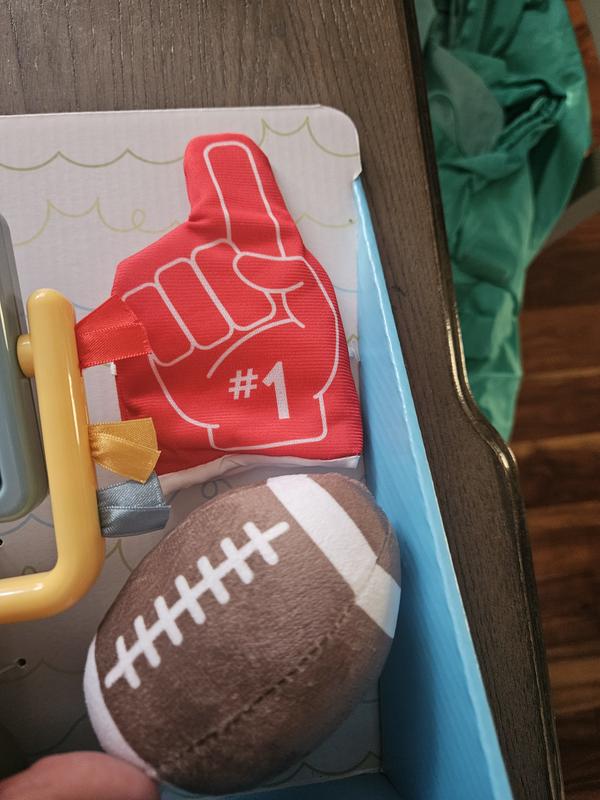 Love, love, love this set of football themed toys. Football is a big deal in this house and even the smallest members of our family want to be in on the fun. My 3 month old loves all of the different features that come in these toys, the crinkle #1 sign, the mirror on the back of the play board and the chip teether have been his favorite. I highly recommend this toy set for the little football fans in your life!