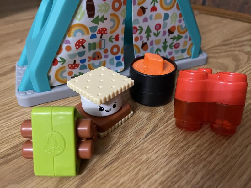 The Fisher Price S'More Shapes fun camping tent was an excellent addition to our child's playtime toys. Not only is this a toy for her but also a great innovative tool to learn shapes and sizes. The design is wonderful in teaching her how to line up different shapes to get them to go inside the tent. Another great design is how also each piece is unique in itself. Each piece moves and does something different as well. This keeps our child's focus and attention. She is also able to play and learn from these pieces individually even without the tent. We are giving this rating only 4 stars however because the tent piece is not built sturdy enough. The tent fabric is not rugged enough as it has started to separate after only a few playtimes. Also the pieces fall out of the tent way to easy. Overall despite the tent piece our child has had a fun and learning experience.