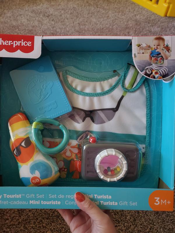 Overall, I really love the theme of this set, and my toddler was very much drawn to the rattle camera. He is a bit old for the bib at 16 months as I feel that it is made more as a drool bib versus a bib for meal times, but it is washable! I washed it and it held up great. He chewed on the "passport" a bit and was not overall interested in the "sunscreen," but I do think he would have been more drawn to those items as a smaller baby around 6-9 months old.