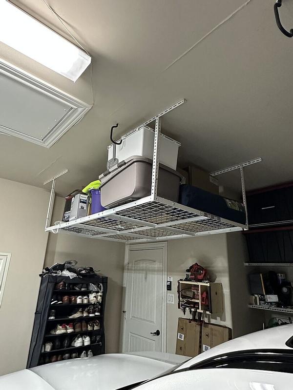 FleximountsOHK38-E 36″ W × 96″ D Adjustable-Height Overhead Garage Storage Rack with 8 Hooks (White)