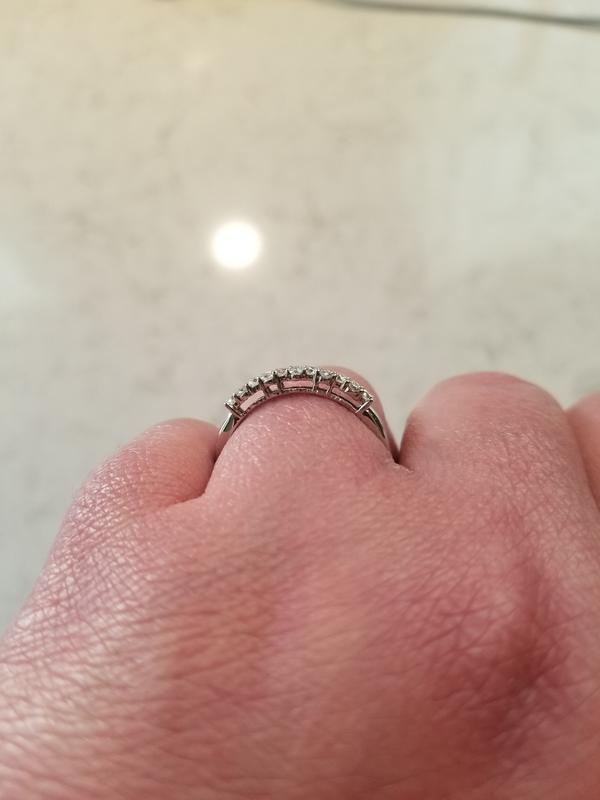 Beautiful ring , perfect to wear to work and very sparkly. Runs true to size I ordered size 6 so it doesn’t slip around when wearing.