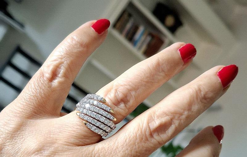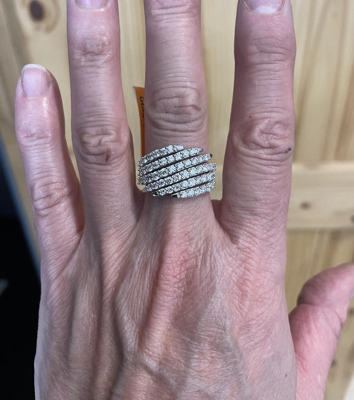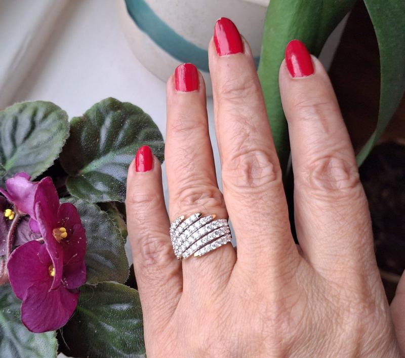 This ring is GORGEOUS!!! The diamonds REALLY sparkle! When I opened the box, both my husband and I simultaneously said, "WOW!" The design is contemporary and looks great! I bought the sterling silver one and am not disappointed with it. The silver really shines and is thick enough to be durable. Trust me; you will know the second you open the package that this ring is a keeper. (I must add: the ring is large but not in any way gaudy or fake-looking. Its size might be a factor if you decide to buy it. Someone with short fingers might not be able to wear it comfortably.)