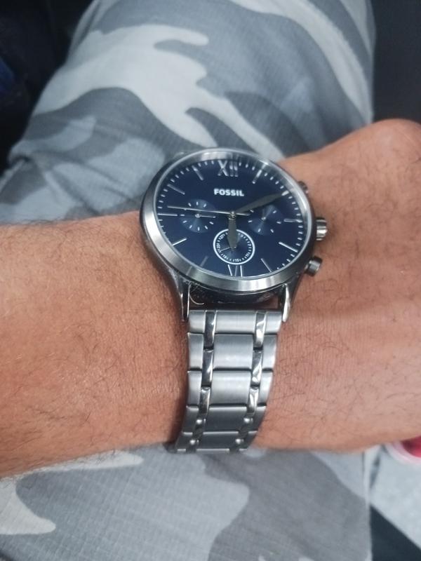Fossil's Fenmore, 44mm multifunction watch features a gunmetal bracelet with blue dial. Style #BQ2401.