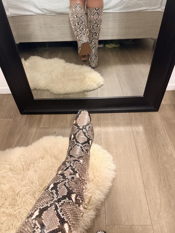 I had been searching for a snake skin boot, Whether it was due stying or fit I wasn’t having success. I went into Macy to actually return a pair that didn’t fit and I seen these. I tried them on to my surprise they fit perfectly. I’m actually a size 6-6.5 but the 5.5M fit they must run big cause I don’t usually fit that size. Nevertheless I’m so happy with my purchase. The heel isn’t too high very walkable and the foot bed is comfortable inside. I have thick calves and these fit perfectly.