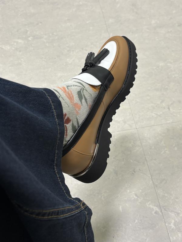 The chunky platform bottom and tailored tassel details bring extra style to this contemporary lug-soled loafer and take menswear-inspired tailoring to chic new heights. Easy slip-on wear capable of dressing up or down. Half size up reccomended.