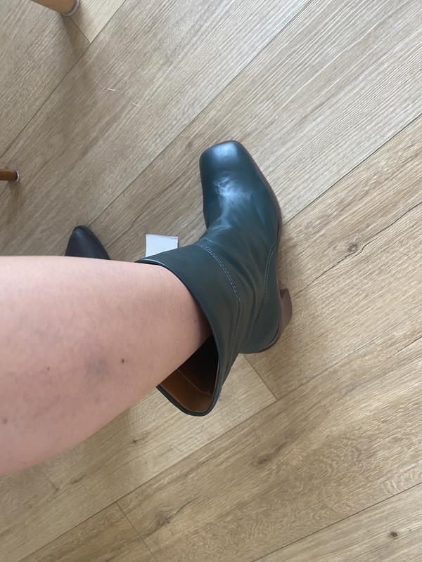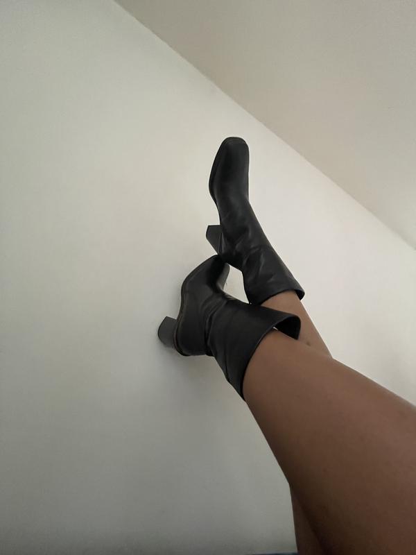 Love the look and style of these boots. They are very comfortable, heel is perfect and the leather is very soft. I usually wear 5-5.5 in shoes and ordered them in 5.5 and were the perfect fit! I do have narrow feet. Calf size is somewhat narrow just to keep in mind for people with wide calves. Overall I love them and plan to get them in brown color too.