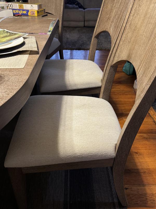 Wow… all I can say is WOW! This dining set is the perfect modern farmhouse addition to our home! The simplistic yet tasteful design on the legs of the table and the oval shape of the table gives our home the perfect look it needed to bring our dining room to the next level! Comfy chairs and perfect size for entertaining. The texture and color of the furniture makes it easy for us to decorate our home however we want as it is a versatile piece. The cushion of the chair has been very easy to clean especially since have two toddlers in our home. It is a staple for your home!