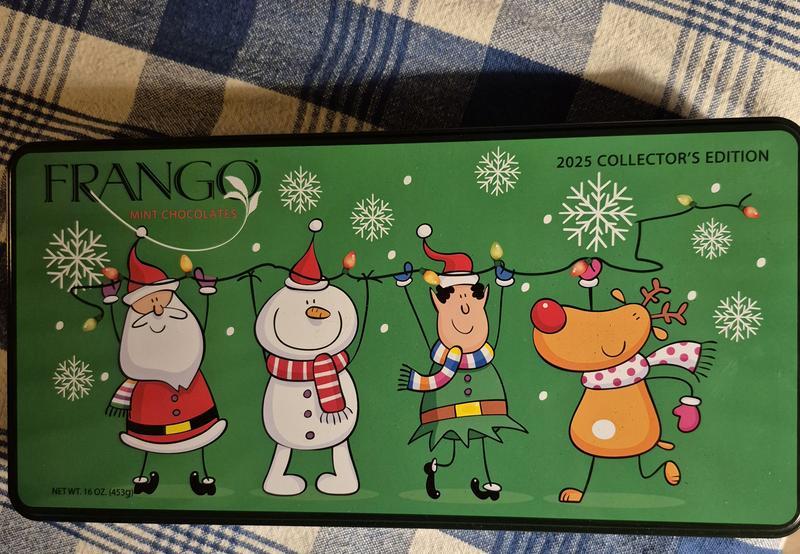 A delicious chocolate Frango mint in a festive holiday tin. A holiday tradition, I continue to pass on.