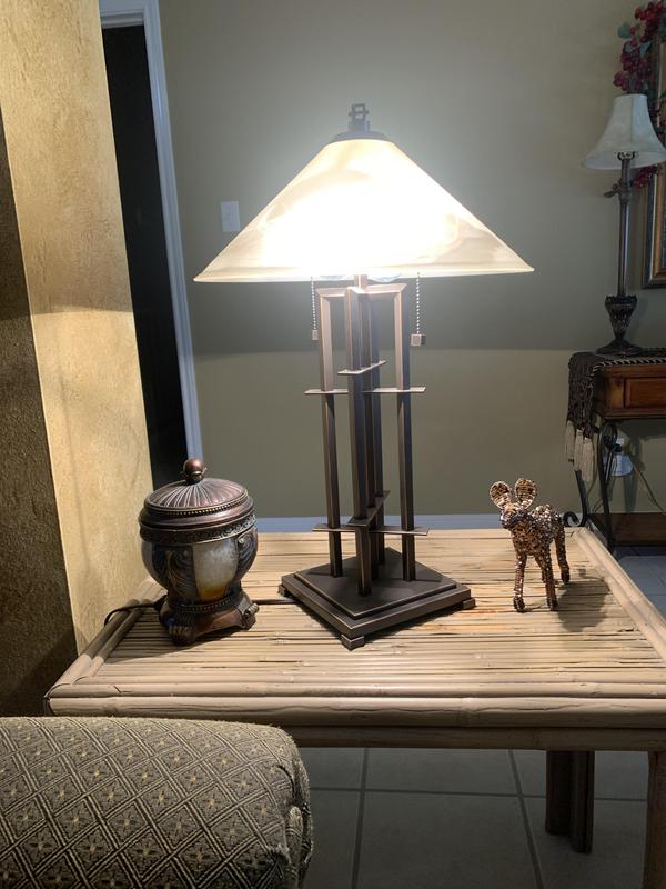This table lamp was securely packaged for delivery & very easy to put together. It complements the other lamps I have in my living room that's why I selected it. Light bulbs were easy to install & on/off features easy to use.