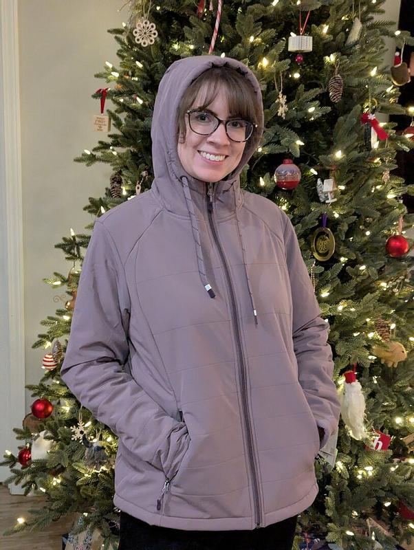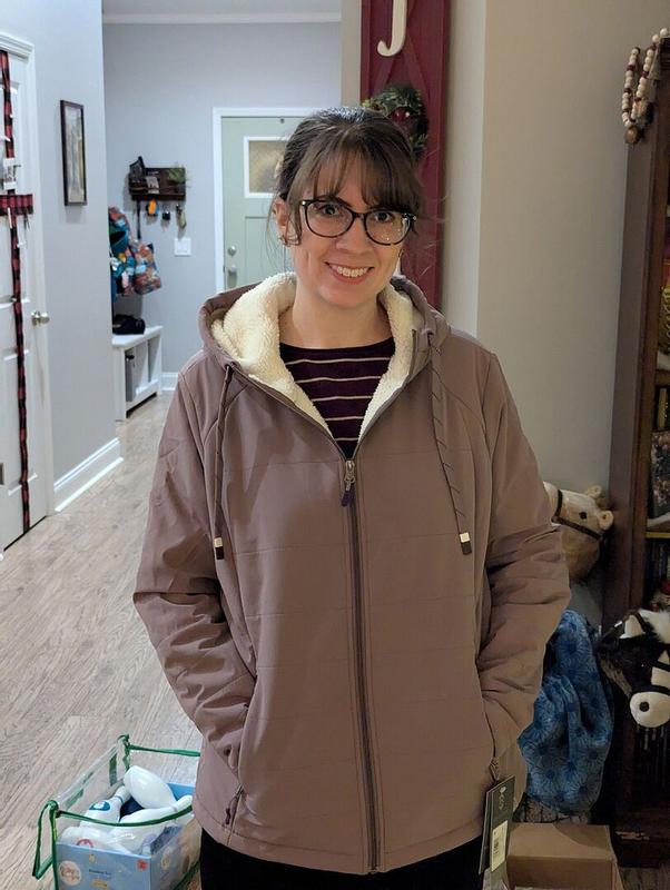 I really like the color (vervain), and appreciate the sherpa lining throughout the jacket. When I put it on, it's immediately warm versus having to wait for my body heat to warm up the lining like in a lot of other insulated jackets. The elastic gathering at the waist in the back is flattering and prevents the boxy look that a lot of other heavier jackets tend to have. When I tried on the hood, I was wearing my hair in a bun and it was still deep enough to cover my head - an A+ design! I got a size larger than I normally wear so that I could layer underneath it - it's big as I expected, but will be perfect with a sweatshirt underneath!