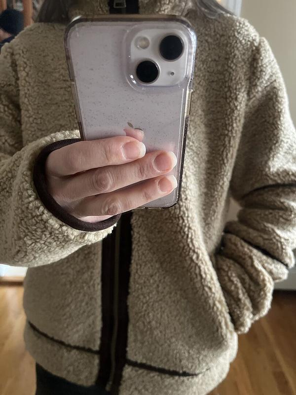 This jacket is cute and stylish. It fits well overall, but the sleeves are much too long and can’t be adjusted so I will need to have them shortened. I love the teddy bear texture and color. The pockets look cute but I wish that they had zippers so that my stuff wouldn’t fall out