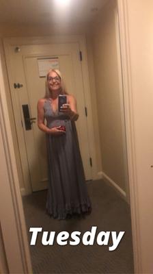 I ordered this dress in the slate color in a size medium. I'm 4'10 and it's a little long for me but it's prefect with wedges. I'm also a 36D and it fit really well! I highly recommend this dress! It's gorgeous!