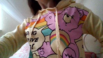 It's cute and very soft but theres a few things I don't like about it. the color is like a almost-pastel yellow but not all the way, not like the soft cream color shown. cheer bear is more of a purple-magenta than pink, its not like a crop shown in the image but more of a longer shirt. the hoodie strings are the same color as the shirt, not white though. overall im kinda disappointed but its a comfortable and cute shirt.