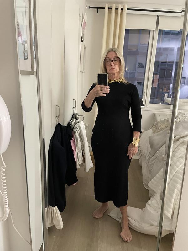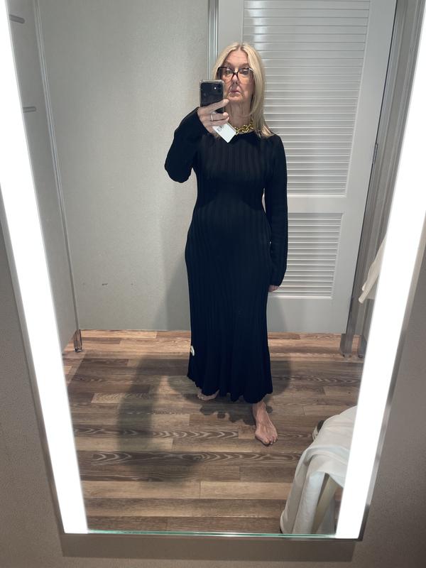 Soft knit, wonderful color, but only fits above the waist. The bottom half of the dress is huge and that's how I look wearing it.