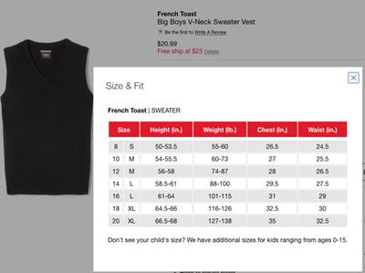 The size in the online chart does not match the product received. The size large actually fits size 10-12, not 14-16 as per the online sizing chart. What I received is far too small for being a 'big boys' size. You wasted a lot of my time & energy on a product that was not advertised correctly.