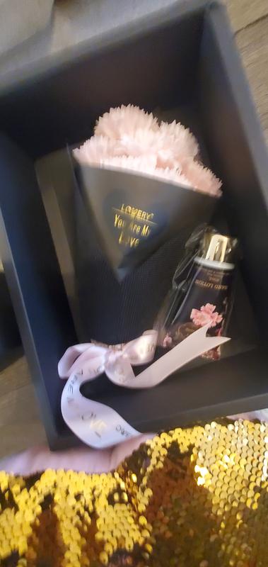 This is a nice gift if you want to tell someone you love them. It was a sturdy black paper box that has a small flower and a heart shaped sticker that states "you are my love" on the front. Inside the box is a hand lotion in a fresh peony scent. The hand lotion soaks into the skin without being oily and leaves a pleasant scent. Also, in the box is a pretty bouquet of pink soap flowers. The flower petals dissolve in water. They are almost too pretty to use. A sequined heart shaped decorative pillow comes with the box. A very pretty, thoughtful gift for someone special.