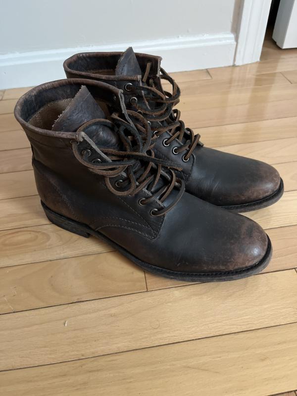 I'm a big fan of Frye boots and own around 7 or 8 pair, especially the Bowery line. Of late I find myself wearing the antiqued version Bowrey more than anything for that well weathered look and no fear of new scuffs. I bought those from a reseller and they came deliciously scuffed. I love the cut and fit of these Tyler boots, the leather laces and the wonderful smell right out of the box. It takes a bit longer to put these on and snug the laces since my Bowrey boots have that convenient side zipper for access. Why just 3 stars? Because the finish is nothing like their photos with almost zero antuquing and absolutely no wear. Basically I got a pair of black boots. FRYE, please don't advertise a look and then send something completely different. Im sure it takes some extra steps, pun intended, not unlike acid washed jeans. Months back I had to return several other boots for reasons related to finish or sizing. We are required to pay for return shipping, which I understand, but not if what they send is not what they advertise and picture. I did use a Labor Day code which I appreciated. But I was not allowed to also use my accumulated reward dollars. WHY? Didn't I earn those dollars? Anyway, I still love these boots. But it's not what I ordered or wanted. I'll supply my own wear over time, but don't order the antiqued model. If they're not willing to insert the extra wear procedure, then please change your advertising photos.