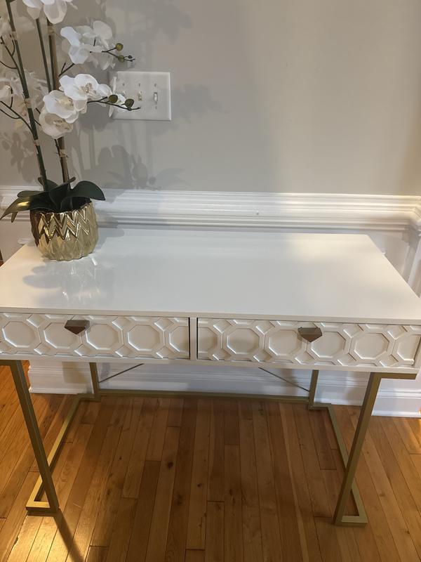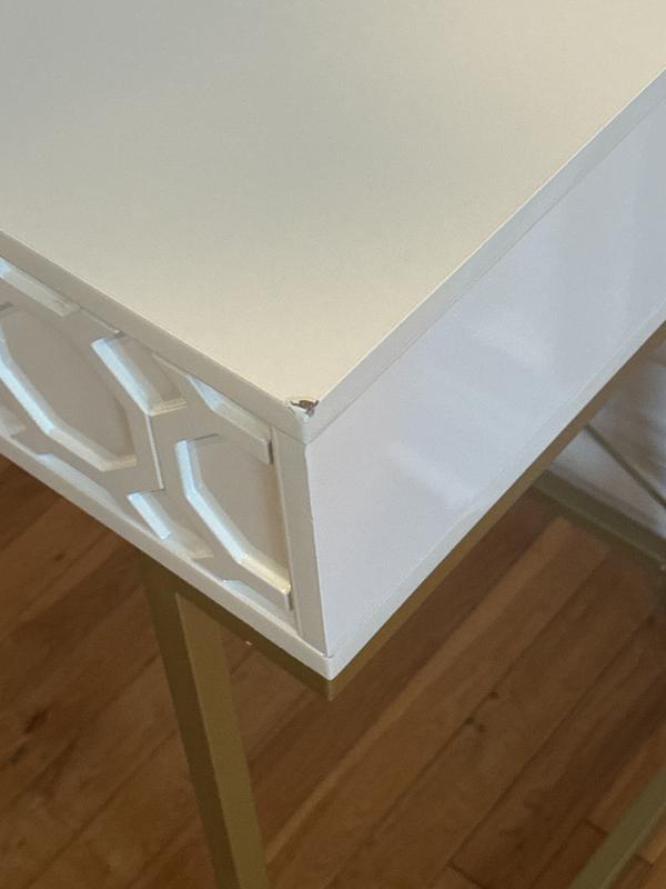 The desk has beautiful designs and hardware, but unfortunately, I receive the package with a damaged box! Nevertheless, I still had high hopes for this desk after assembling it I noticed there was a chip on it. I should’ve known from how the box looked before I assembled it.