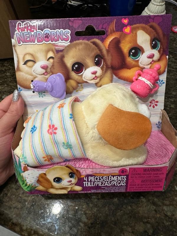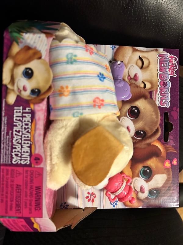 this furreal newborn puppy is absolutely adorable. It’s a cute little size it’s wrapped in a cute little blanket. It makes adorable sounds and when you push the tongue down the eyes move it is absolutely adorable. My little girl loves it.