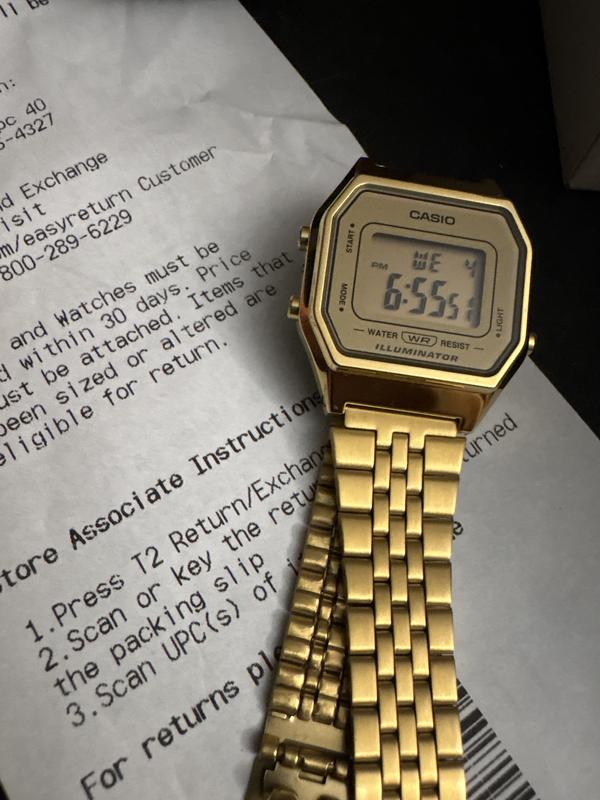 I purchased this watch as a gift I needed right away, I even paid extra to have it rushed here just in time. The watch arrived with several signs of being a returned/open box item. The metal band was missing its protective plastic film, and the plastic film on the face of the watch looked as if it had been removed, gotten dirty somewhere in the bottom of a dustbin The packaging was torn where the watch is situated into the little box it comes in, like someone had clearly ripped it out. The I noticed someone had clearly used the top of the watch box (stylized, branded design made of a heavy cardboard) as a surface to write a note! there is clear handwriting indentation all over it. Theres no way this happened during shipping because it was in a bubble mailer. I am really disappointed because I do not have time to wait for an exchange. I contacted customer service and they offered me $10 refund (insufficient in my opinion). I would urge others to order this anywhere else but Macys.