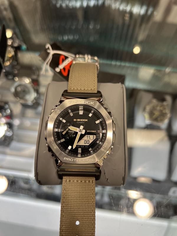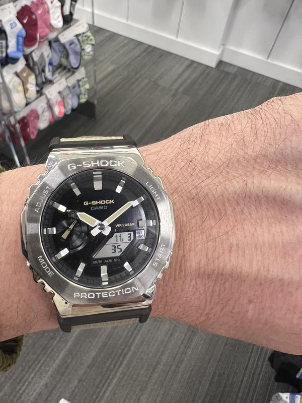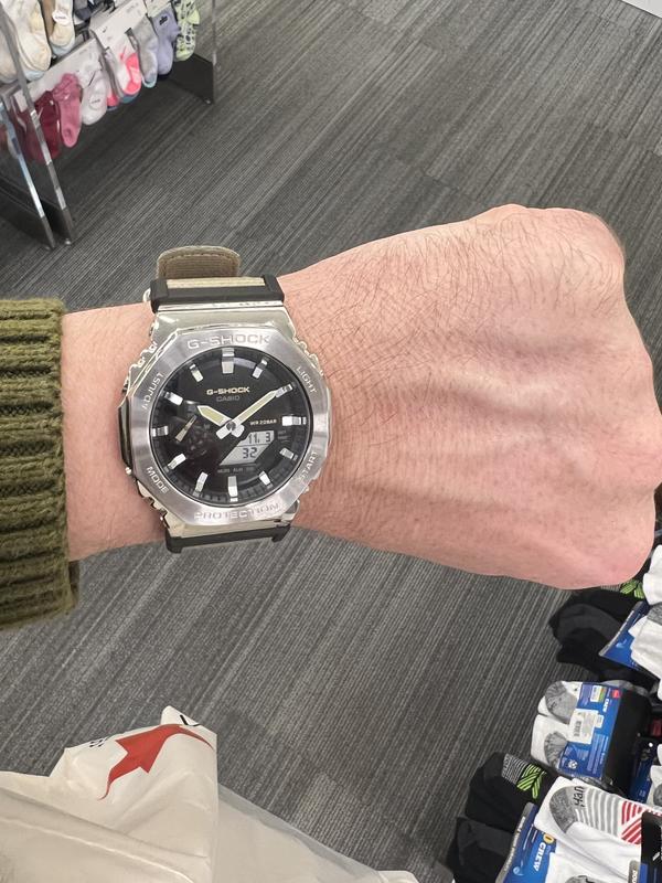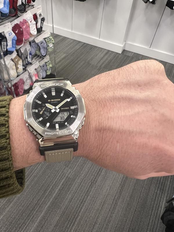 I love Gshocks but they are too large for my sub-7 inch wrist so I've been on the hunt for a metal Gshock that works. When this beauty was announced in February, I had to have it. As soon as it came to the states, I placed my order. Received it today and, let's just say it exceeded expectations. Pros: Metal Casioak, silver bezel with black dial (maximum contrast), positive display, back lighting, strong lume, nice fabric band (giving it a very young, hip, but manly look). Cons: Retainer on the fabric band is a bit janky. Would like in next version: Make it solar. Don't care about Bluetooth. I'll do a YT video review of it in a few days. It'll be titled "Best-looking metal casioak, yet".