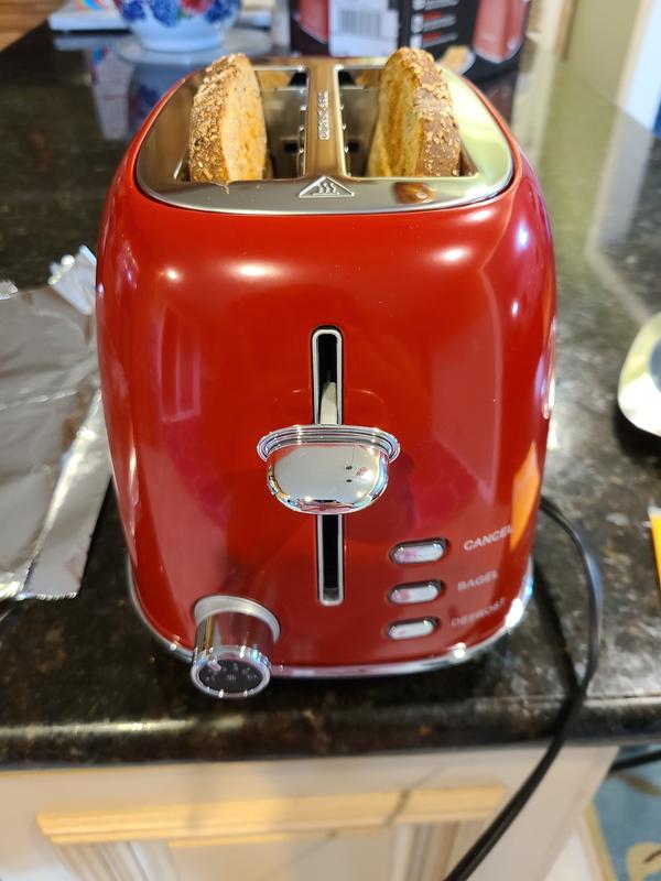 I got this Galanz Retro toaster because it was cute and fun. I love it! It has options for toast or bagels. The dial for toasting clicks and you are able to move it in between numbers and not just 1-6. The feature I love about it is you can raise the handle and the toast will come up higher for you to grab.
