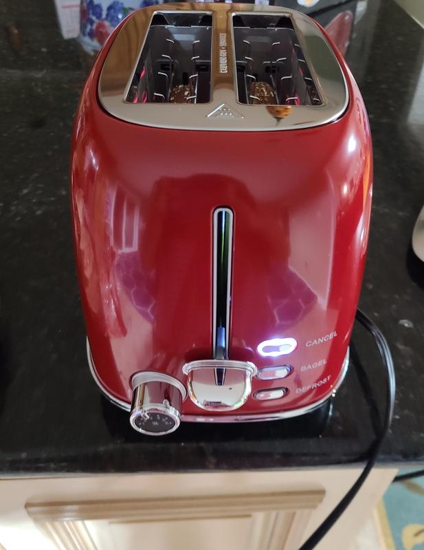 This bright red retro design does a great job toasting bread slices or bagels. Thought it looks retro, there are LED lights to cancel, do a bagel, or adjust if frozen. You dial the temperature and duration and we find it toasted evenly and well. There is a cover over the top included but we didn’t find it necessary. This unit and color perfectly matched our coffee maker. Looks great and performs !