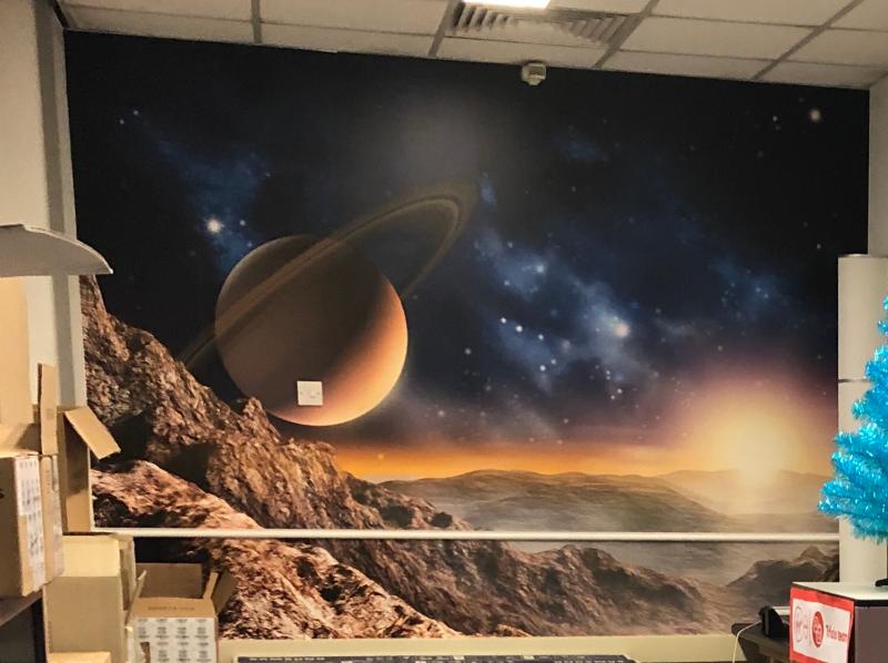 I bought the mural for the bedroom my young grandsons use when they stay. The are aged 8 and thrilled with their 'science' room. The mural was quite easy to put up. As the wall was a few inches smaller than the mural I looked at the whole picture to decide where it was best placed, to keep as much pattern as possible. I also papered over coving and skirting. As a 65 year old great-gran I did a fairly good job, my family are impressed. Would definitely recommend the mural. The delivery service was excellent, following instructions where to leave the parcel.