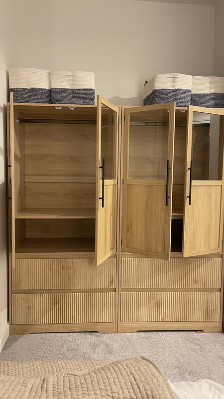 gaomonBedroom Wooden Armoire Wardrobe Closet, Glass Doors, 2 Drawers, Shelves & Hanging Rod, Large Freestanding Wardrobe Cabinet for Clothes Storage