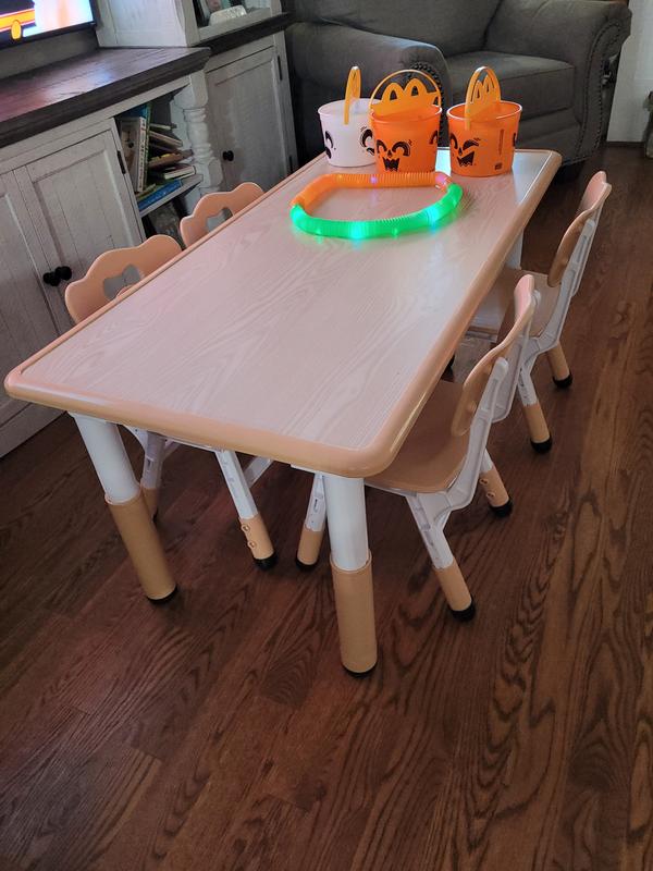 Introducing our Kids Table and 4 Chairs Set, the perfect addition to any playroom or learning space. This versatile set features an erasable tabletop, allowing children to express their creativity with art and crafts while easily wiping away messes. The height-adjustable design ensures that the table and chairs grow with your child, accommodating their changing needs. Safety is our priority, as this set is crafted from safe materials and is CPC-certified for added peace of mind. With simple assembly, this multi-functional table can serve as a dining table, drawing table, study table, or game table, making it an ideal choice for various activities. Encourage imaginative play and learning with this stylish and practical kids' furniture set!