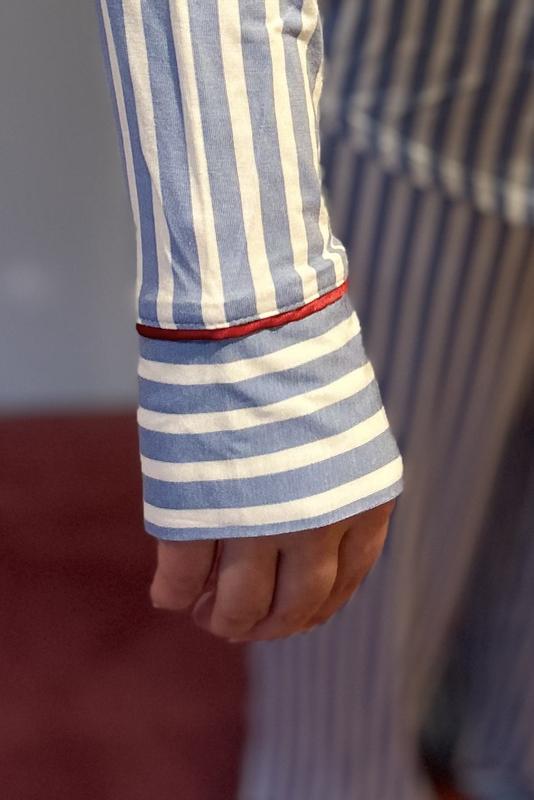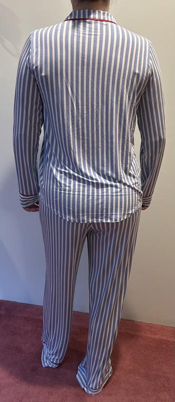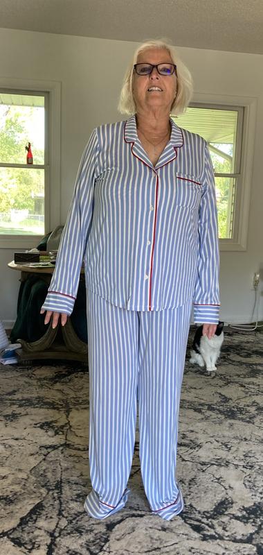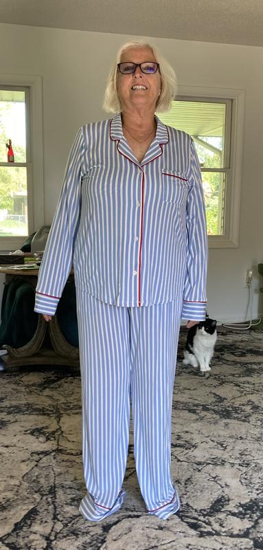 These women's PJs are so comfortable in a model fabric. Also, while a classic pinstripe, they are really attractive in a china blue stripe color, and have a more modern look with a contrasting crimson piping.