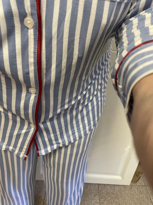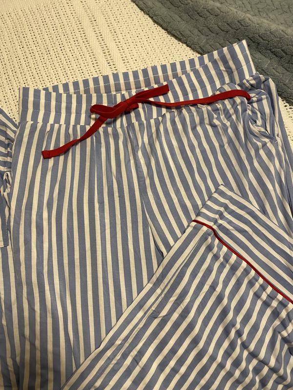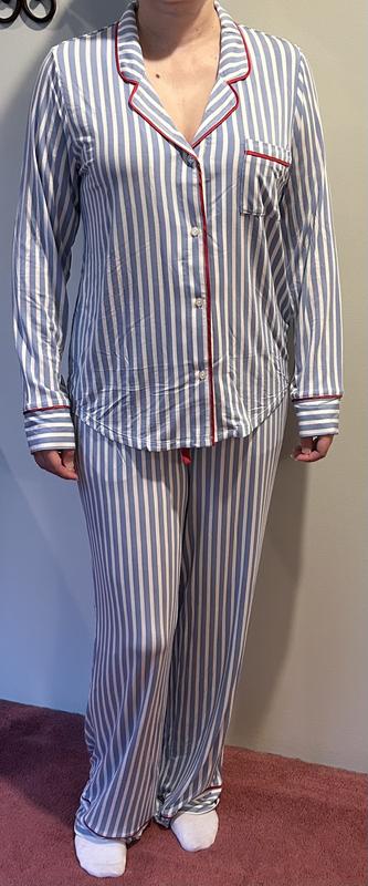These pajamas are adorable. I love the blue stripes with the red piping! The pants have an elastic waist and it is adjustable. The pants also have pockets! This material is buttery soft and feels luxurious. I am 5’4” 120 lbs 34DD and I got the size small. Fits very well.