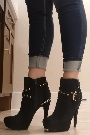 The Deeka booties from GBG Los Angeles take any look through the roof with crisscross buckled strap shining in metallic studs topping off a platform stiletto heel.