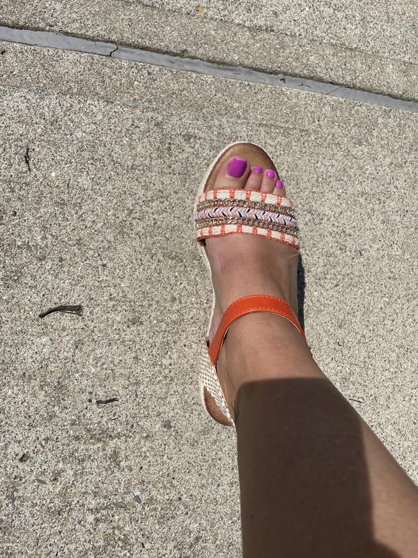 These wedges are so much cuter in person. I ordered them because I thought the details in orange & blue were cute, but the picture online doesn’t truly reflect the product. The shoes are comfortable and run pretty TTS. Maybe ever so slightly large.