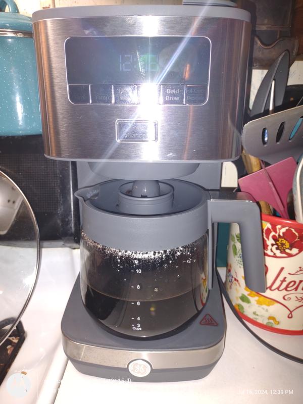 The reusable coffee grounds basket handle does not stay in the holes so I cannot trust it by picking it up by the handle. I've tried bending it to stretch out further but the handle has a memory I cannot surpass! The male ends are just too short and I have spilled the grounds a couple of times which is a real mess. I have now begun to use paper filters because at the bottom of the brewed pot of coffe, there is a slight slush and I have to dispose and wast the last few ounces. Love the screw design on the lid of the pot! No fear of it coming off when pouring coffee from the carage! I like the 1-4 cup button feature for brewing smaller pots. Wish GE would give an extra filter or instructions on where to purchase filters.