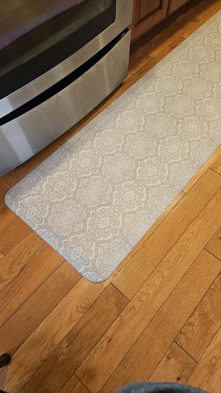 💜 Love my new GelPro mats; good fortune was on my side w this purchase. I ordered the Echo/Grey mats. On the vendor website, the mats actually look a light greyish w darker grey (was trying to blend w tile that I absolutely dislike). Outside under the sun n from my iPhone camera the mats look grey as well 🤷🏻♀️. In my kitchen these same mats appear greenish grey n the darker design pops blending perfectly w my silvery-green cabinets (painted 3 yrs ago n still loving the color). As I have neither an artist gene nor a designer eye in my body, I’ve been hesitant about buying quality floor mats to blend w the kitchen. My knees, neck n back suffer, therefore enough. When I received the GelPro mat boxes, I held my breath thinking I’d likely have to return them due to my color selection. No need to worry. Not even a doubt when I first saw them; PERFECT! The mats are sturdy, yet give enough to create a cushiony, comfortable standing environment. If I could tolerate being barefooted, that’s how I’d stand on them. The corners lay flat, no tripping (on these anyway 😉). I know I’ll get many good years n meals out of these gorgeous GelPro mats. And did I mention the beautiful color… I now believe I should have bought the 4’ sized mat for the cooking area; I’ll be ordering that soon. I’m so thrilled w these mats that the bathrooms are next to get new GelPro mats (no, I’m not getting paid by anyone to write this review, my apologies for my wordiness, I’m happy 😊). Don’t continue to hesitate; go ahead n purchase your favorite pattern from the GelPro mats selections; your body joints will appreciate it. Definitely 5* plus quality. Now I need to get this floor tile swapped out.