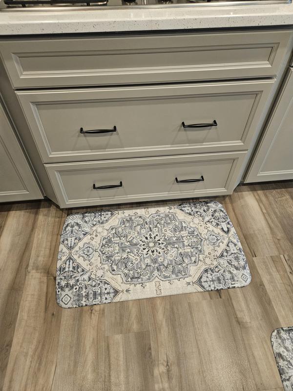 I have the Orchard mat in the Stonewash color -- have had it a few years. I love the look and the comfort. The other good thing is that it's lighter weight than other GelPro lines. However, this means that it's constantly sliding out of position! I am making a career out of straightening it. Not a happy camper about that.