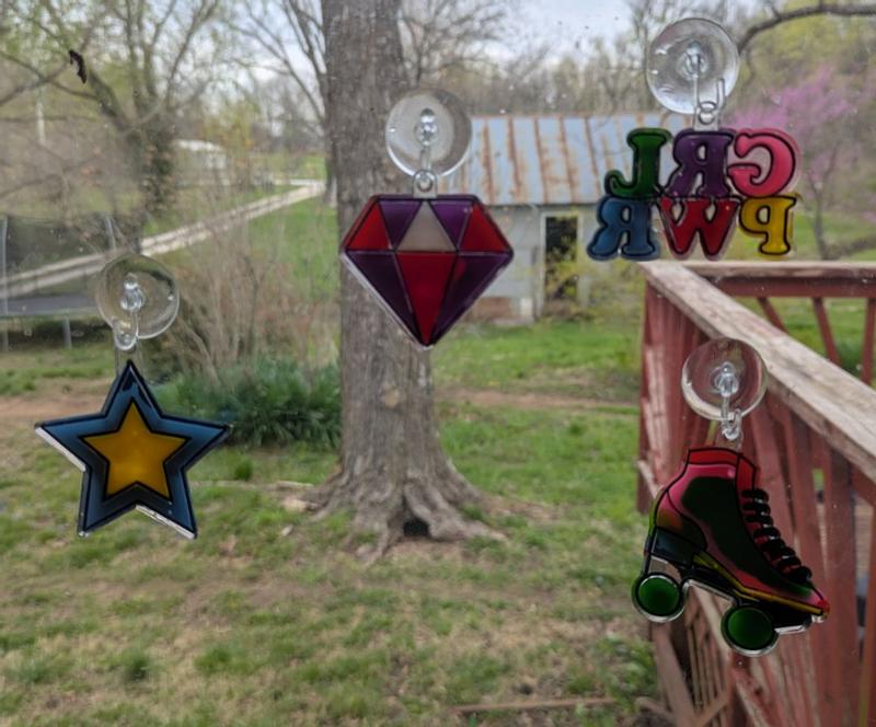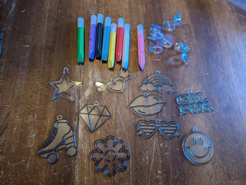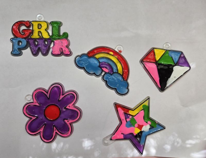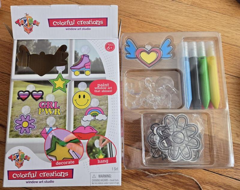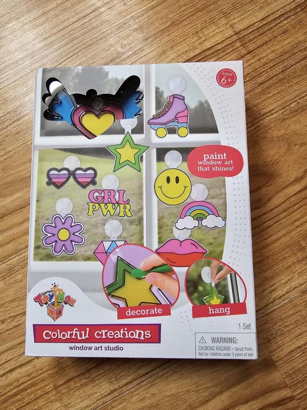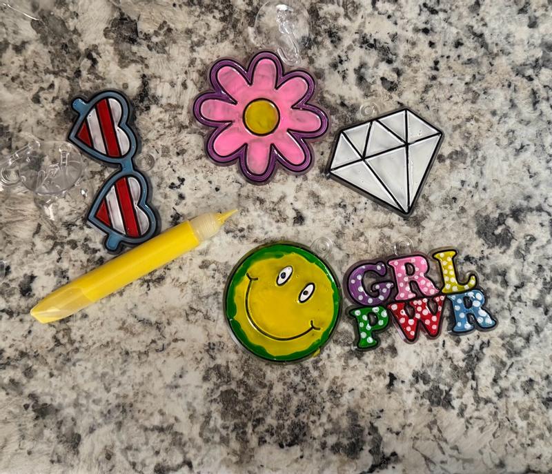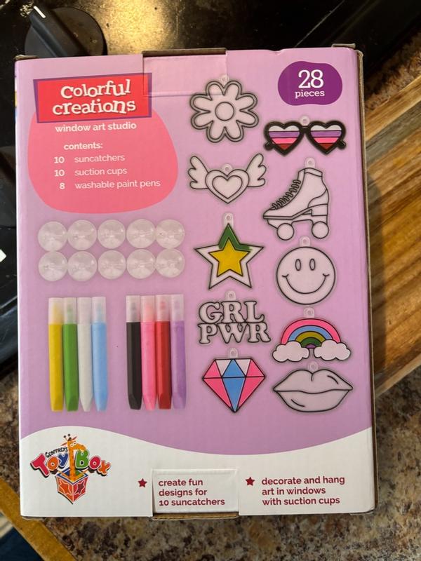 My kids (7, 5, and 4) had so much fun painting these sun catchers. This kit had everything they needed to paint and hang the sun catchers. It came with 10 sun catchers, 10 suction cups, and 8 paint tubes. My son was disappointed that the majority of the sun catchers are girly. He still had fun painting them. One of the sun catchers came bent. The rest were in good condition. The paint colors are vibrant. I don't like how fast the paint comes out of the tube. It makes it more difficult for younger kids to use. The suction cups stay on the window well. It took around 12 hours for the paint to completely dry, but my kids had the paint layered thick because of how hard the tubes were to control.