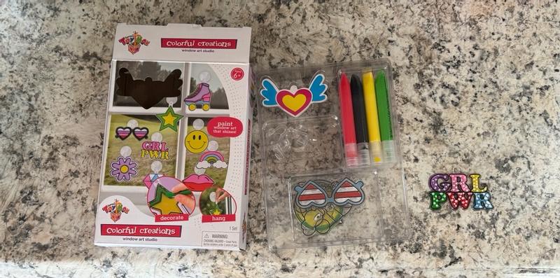 My 5-year-old daughter really likes this Art Studio set. There are a lot of different designs that she was able to choose. She's excited to hang them up on her window. The one reason for a four-star review instead of a five-star review is that the paint comes out way too quickly from the tube which makes it hard to control. Also, for two of the tubes, I had to use a paper clip to break up some dried paint before the paint would come out at all.