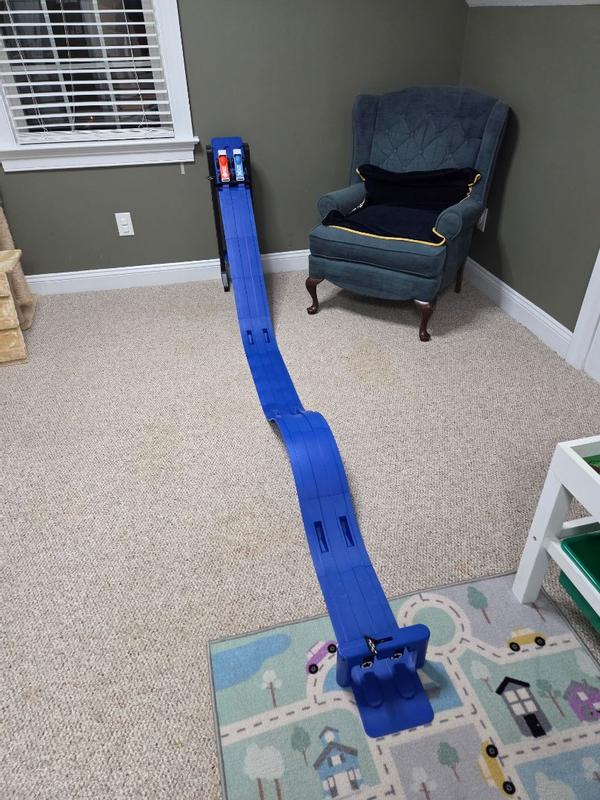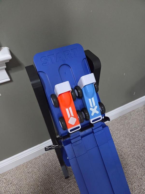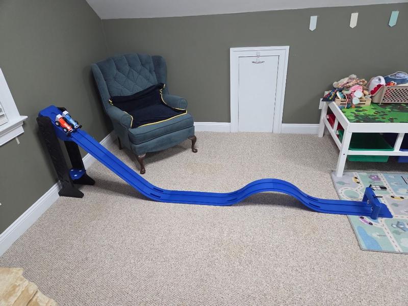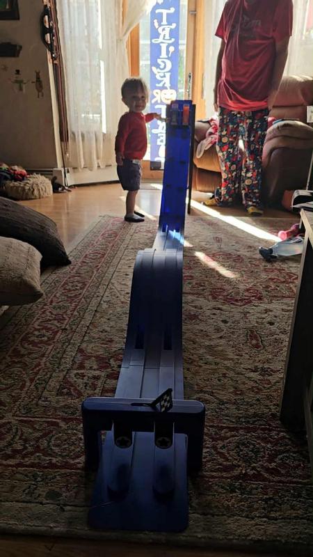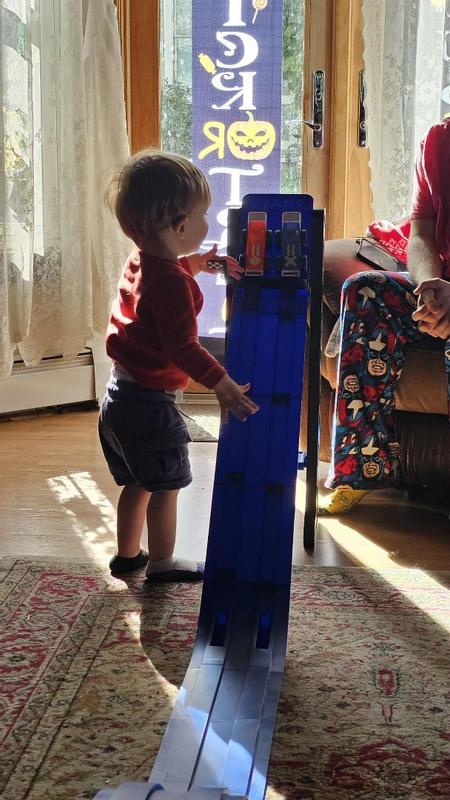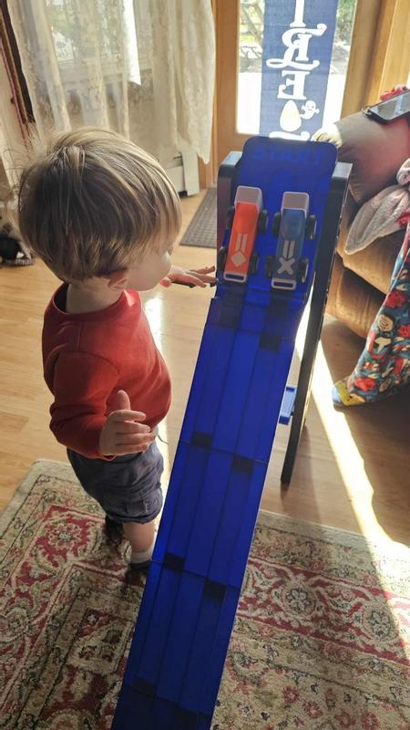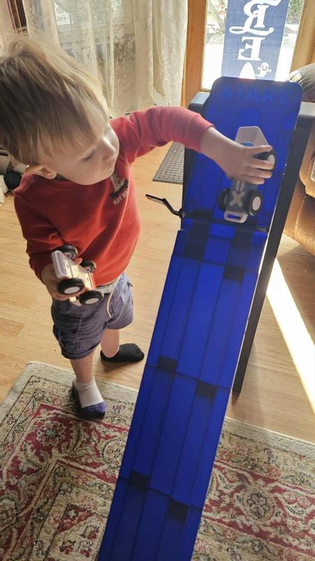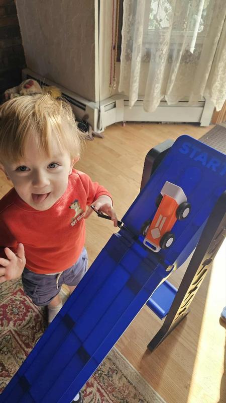 My daughter really enjoys these race cars! It's much larger / longer than I expected, but she runs back and forth to chase them as they fly down the track. Great that there are two cars, so she can play with her brother or friends. Easy to use and good for variety of ages.