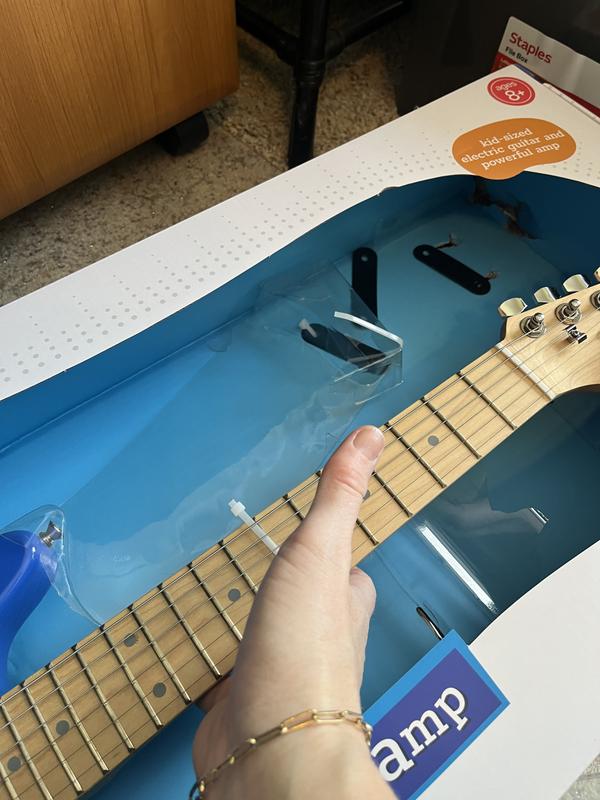 I'd like to take a moment to praise Macy's on having a mom's back this Christmas. This year, I ordered this guitar as a Christmas gift from Macy's and they concealed the Christmas magic with this box combo thingy. As the mom shopper lady from 'Miracle on 34th Street' declared, I'm going to be a Macy's customer for life! That all said, my son is left-handed, I don't see where on the packaging the guitar mentions whether the guitar is meant for righties or lefties. It's not something I thought about when I ordered, however, it's a consideration to mention prominently on the packaging so that people DO consider it. Comes with an amp, cords, extra strings and a strap!