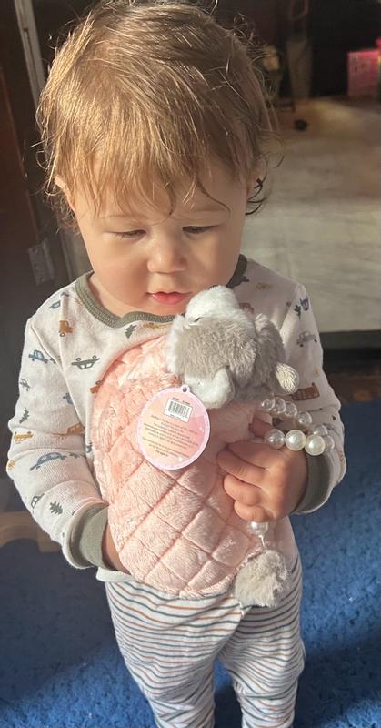 Comes with a little quilted carrier with pearl handle. Very cute, very travel-toy style. Has a zip compartment, more functionality; could carry little things. Made of super-soft polyester, handles, and a compartment inside. According to the manufacturer, the zipper is smooth. Very plush, soft feel, good “toy purse” feel, less structured. It had a neutral smell and easy to put together.